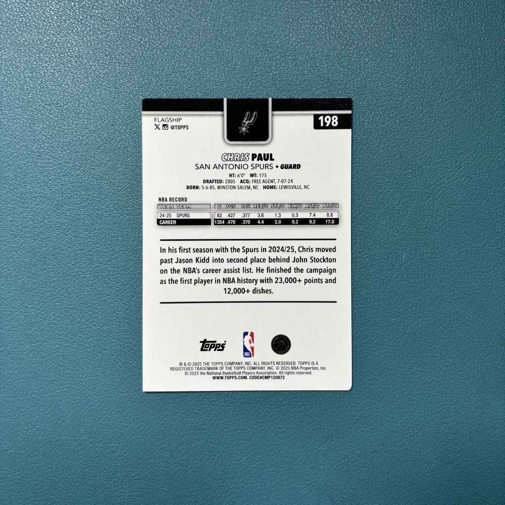 Esta carta pertenece a la colección Topps Flagship y corresponde al número #198 dentro del set. Chris Paul es reconocido por su inteligencia en la cancha, su capacidad para dirigir el juego y su precisión en asistencias, cualidades que lo han convertido en uno de los bases más influyentes de su generación.
