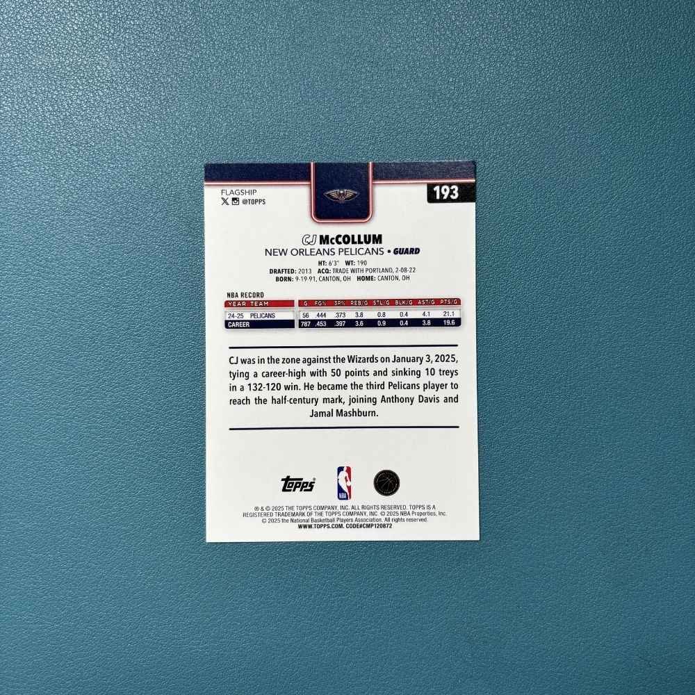 Esta carta pertenece a la colección Topps Flagship y corresponde al número #193 dentro del set. McCollum es conocido por su gran habilidad para anotar desde media distancia, su precisión desde la línea de tres puntos y su capacidad para liderar el ataque de su equipo.