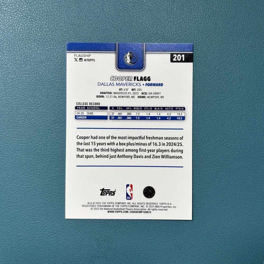 Cooper Flagg fue seleccionado con el pick #1 del Draft de la NBA 2025 por los Dallas Mavericks luego de una temporada extraordinaria en Duke, donde registró uno de los años de novato más impactantes del baloncesto universitario en la última década. Durante la temporada 2024/25 obtuvo un box plus/minus de 16.3, el tercer mejor entre jugadores de primer año en los últimos 15 años, solo detrás de Anthony Davis y Zion Williamson.