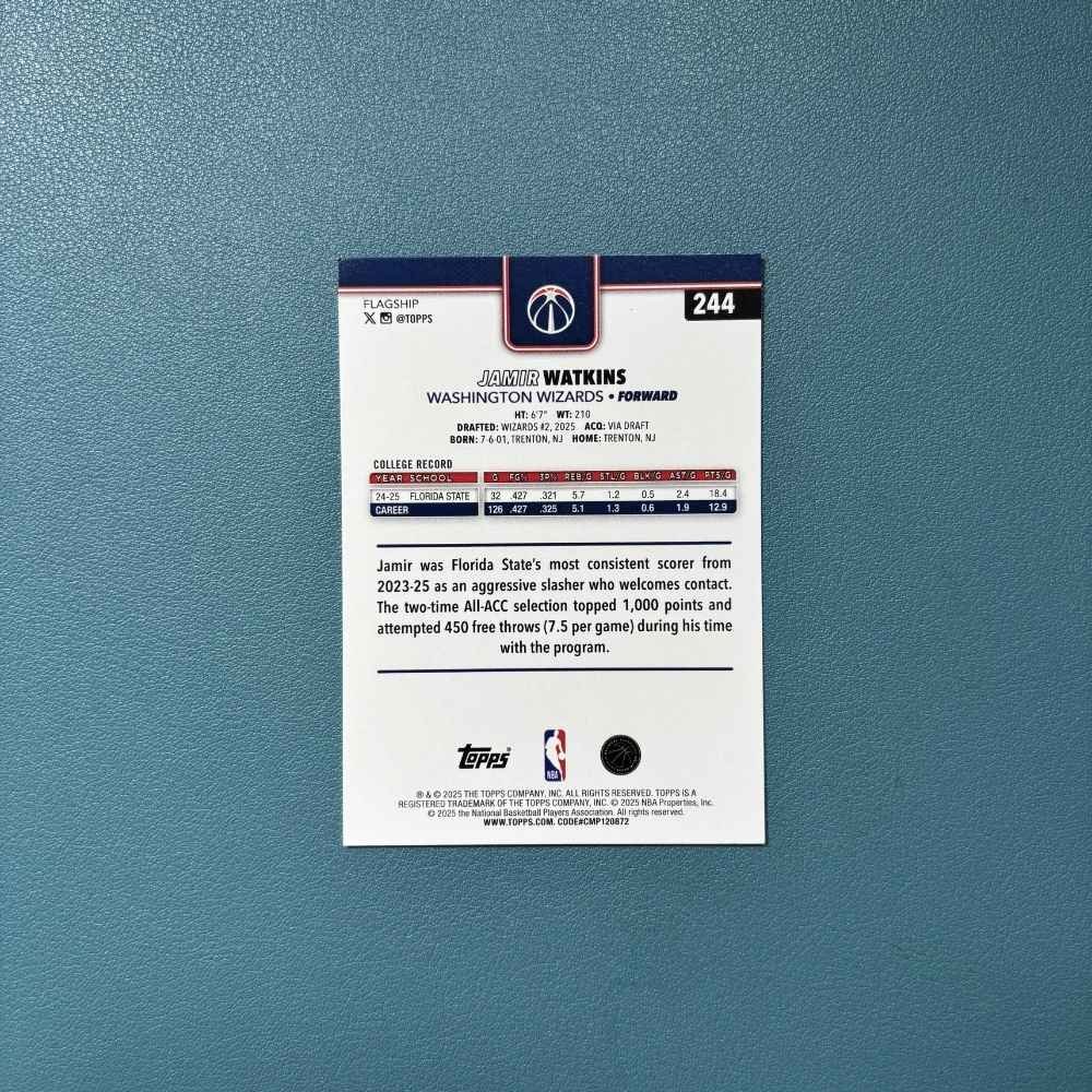 Carta Rookie Card (RC) oficial de Jamir Watkins, forward de los Washington Wizards y uno de los prospectos jóvenes que llegó a la NBA tras destacar en el baloncesto universitario por su capacidad anotadora y agresividad ofensiva.