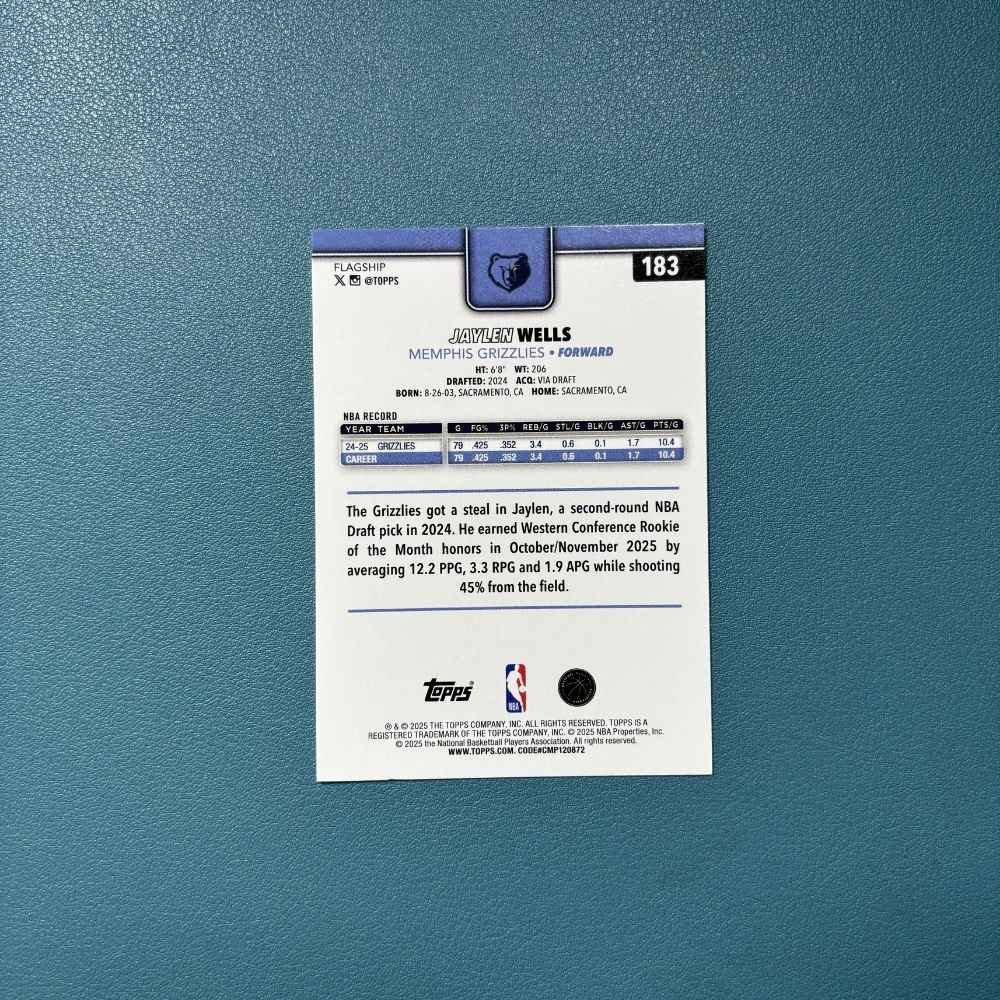 Carta Rookie Card (RC) oficial de Jaylen Wells, forward de los Memphis Grizzlies, perteneciente a la colección Topps Flagship 2025–2026.