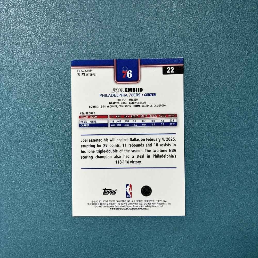 Esta carta pertenece a la colección Topps Flagship y corresponde al número #22 dentro del set. Embiid es reconocido por su combinación de tamaño, habilidad ofensiva, tiro exterior y dominio en la pintura, lo que lo ha convertido en uno de los centros más completos del baloncesto actual.