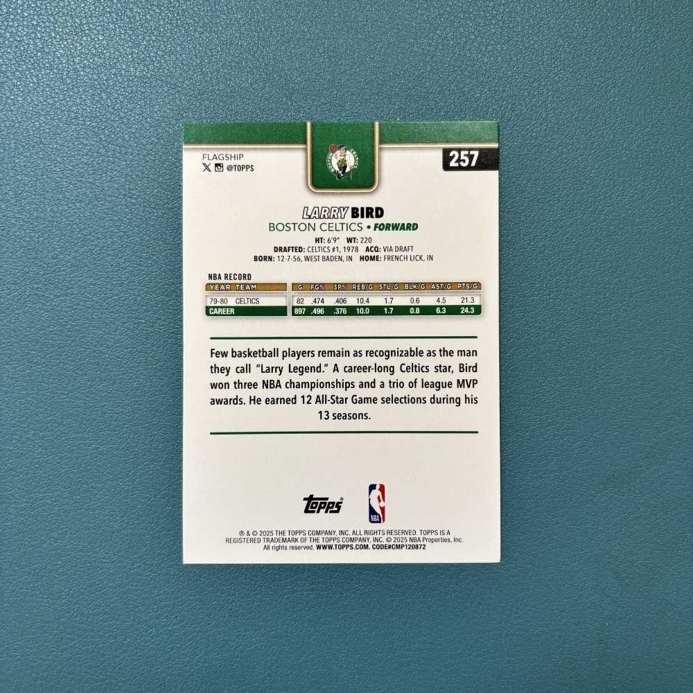 Esta carta pertenece a la colección Topps Flagship y está identificada con el número #257 dentro del set. Bird es recordado por su extraordinaria inteligencia en la cancha, su capacidad anotadora y su liderazgo, convirtiéndose en uno de los jugadores más influyentes del baloncesto.